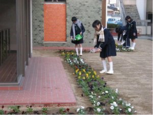 | 夏休みに合併浄化槽を撤去した後、更地になっていた保健室前の中庭に町からいただいたパンジーの苗を植えました。期末テストが終わった後、2・3年生のボランティアの生徒たちによって、500本近くのパンジーがきれいに植えられました。今までちょっと寂しかった中庭も美しくなりました。 | |