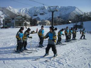 | 17日、雪の量も豊富で、大山山頂や日本海の弓が原がきれいに見れる絶好のスキー日よりになりました。初めての生徒も7割近くいて、不安と期待が入り交じる中、おそろいのスキーウェアに身を包み開校式が始まりました。初日は、インストラクターの先生からボーゲンを中心に滑り方・止まり方を教えてもらいました。2日目は、起床時間頃から降り始めた雪が絶え間なく続き、一時は吹雪の様相。しかし、この日は、リフトの一日券をもらい、歓声とともに何度もコースに挑戦する姿が見られました。クラスによっては、上の原や中の原のスキー場へも出かけるクラスもあり、上達した姿が見られました。夕食は、ジンギスカンで盛り上がり、インストラクターの先生を囲んでのミーティングもとても楽しいものとなりました。最終日も、あいにくの雪となりましたが、ほとんどのクラスが上級斜面に挑戦しました。滑れない友達に手を差しのべ、励まし合う光景がたくさん見られ、友情の絆も深まったのではないでしょうか。あれほど吹雪いていた光景も、山を下りると穏やかな日差し。この日差しのように暖かい心遣いのできる学年に成長して欲しいですね。 | |